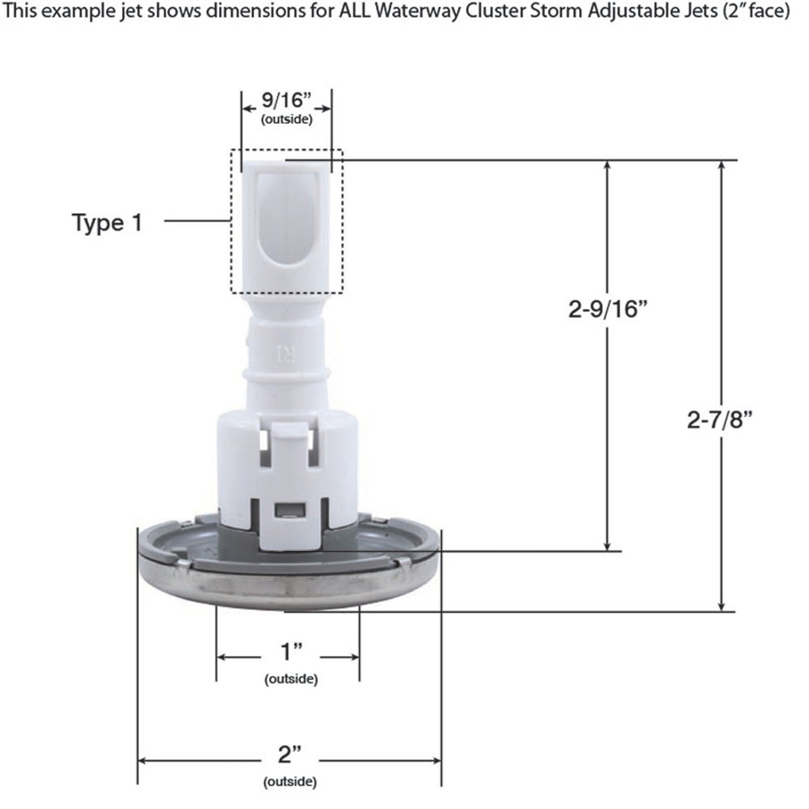 Jet Internal, Waterway Cluster Storm con difusor a presión. Cara festoneada texturizada de 2" de color blanco, con interior estilo Twin Roto y control de encendido y apagado ajustable. Disponible en otros colores y estilos.