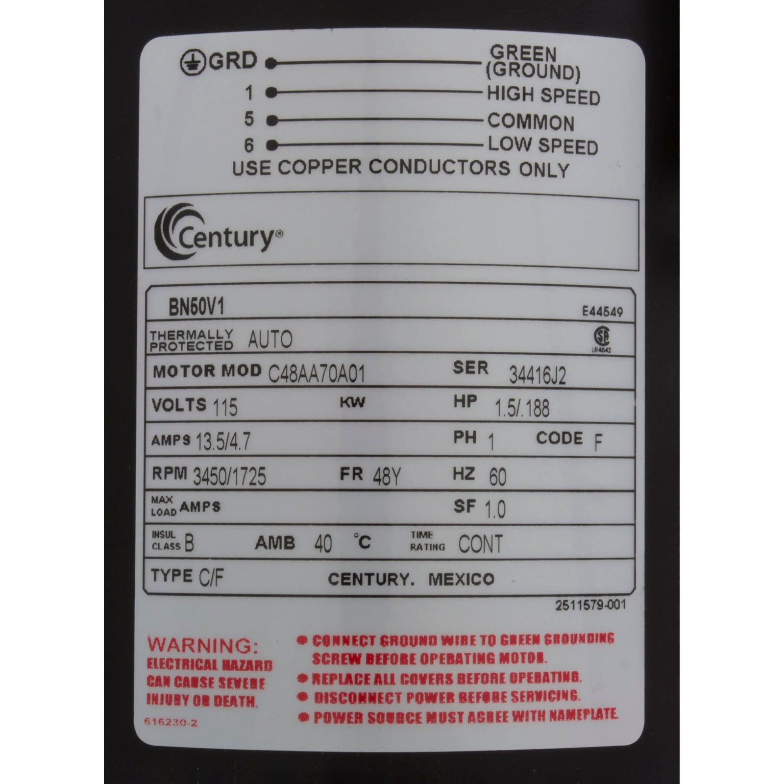 Motor, Century, 1.5 Horsepower, 115v, 2 Speed, 48 FrameFeatures: