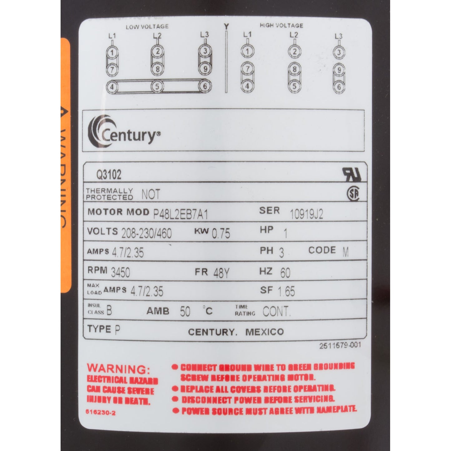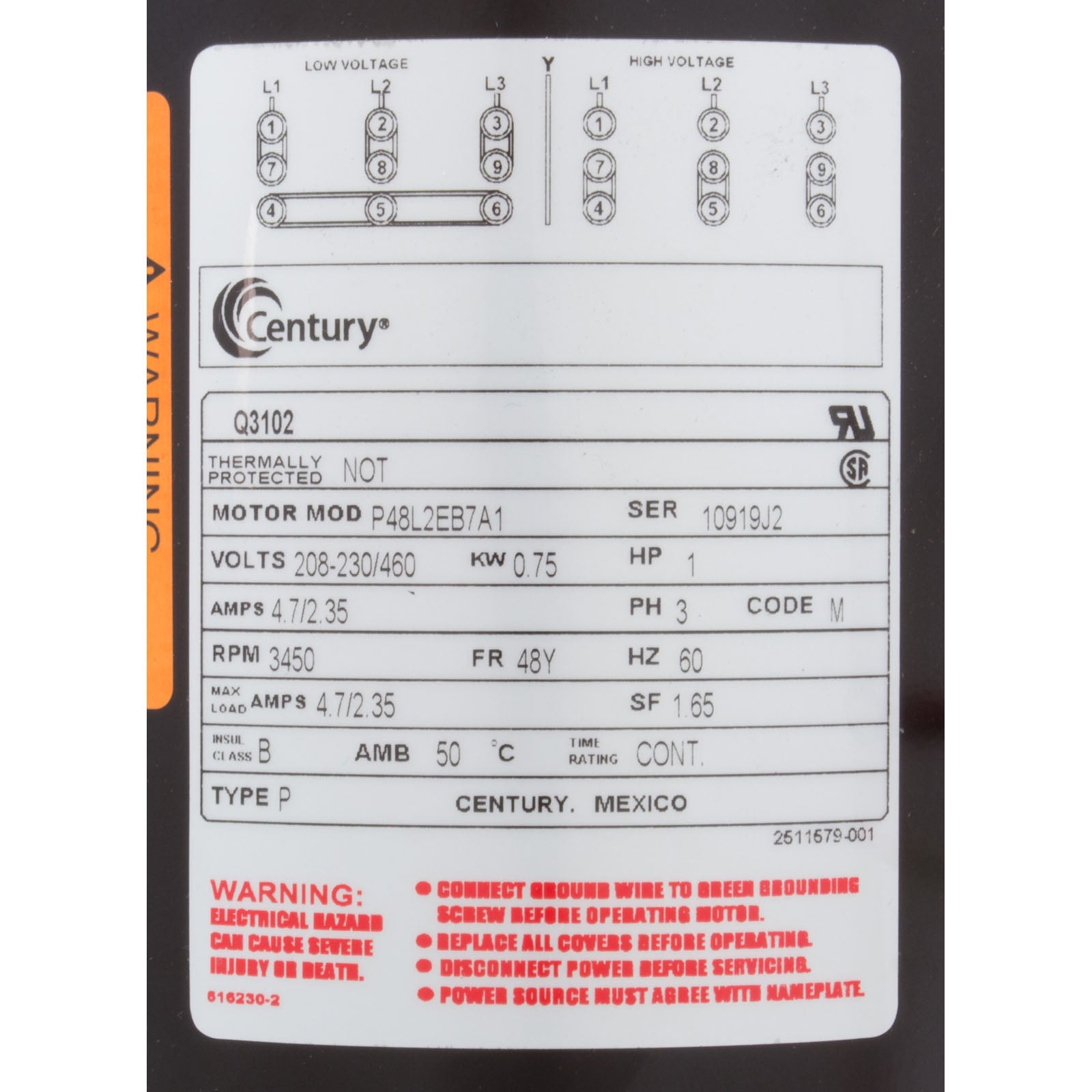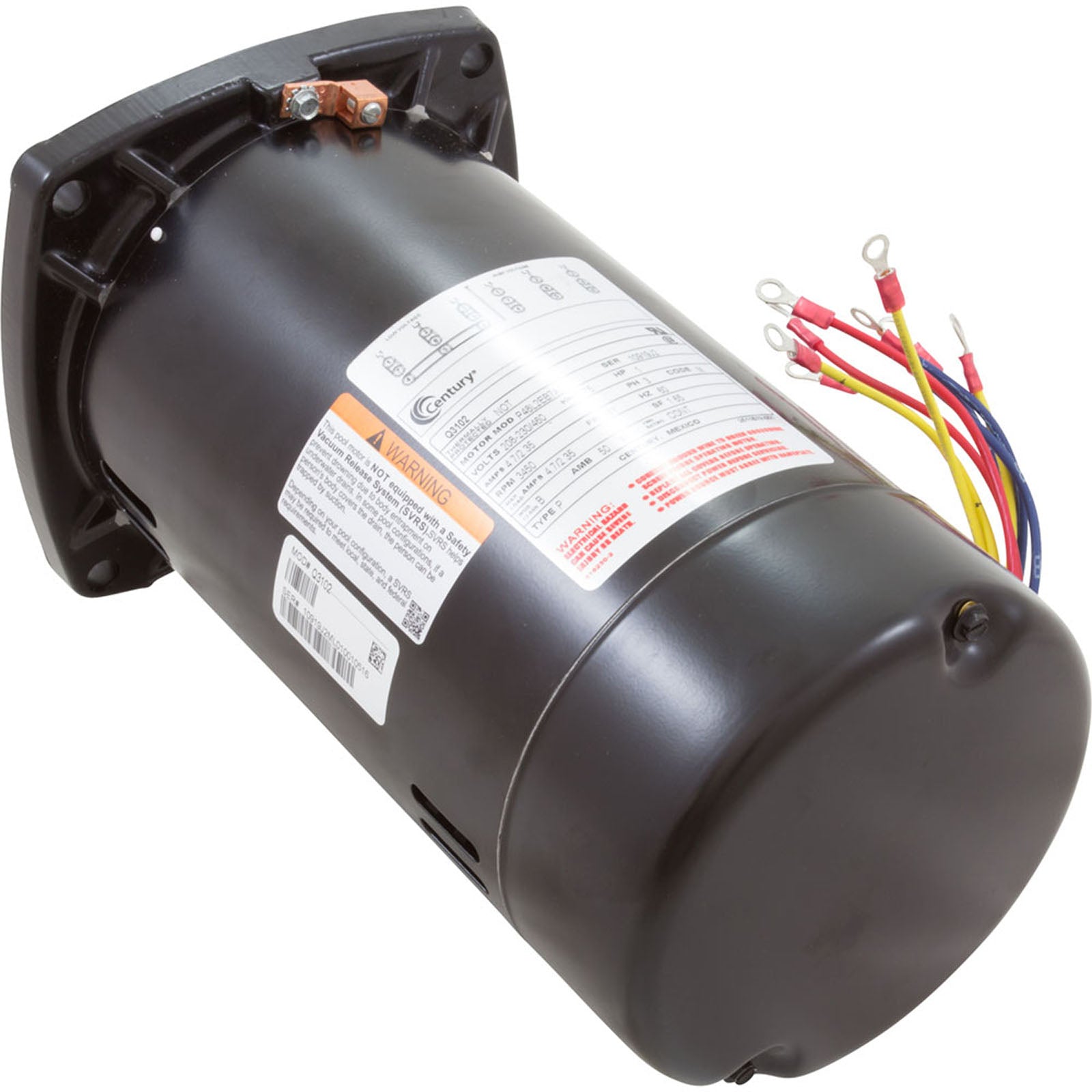 This Q3102 Motor Centurymotor delivers 1 horsepower at 3450 RPM, operating on 208-230/460V 3-Phase power with a 48Yfr frame and a 1.5 service factor. It is a single-speed motor suitable for pool and spa applications.Additional Info