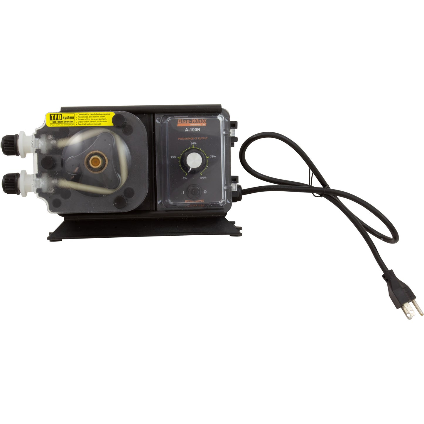 Blue-White Industries A1N00A-6T FLEXFLO A-100N Peristaltic Metering Pump with Analog Timer for Chemical Feeders are well suited to metering chemicals that could foul heads with conventional check valves. Peristaltic pumps have rollers that compress the tube in aprogressive squeezing action. Blue-White’s superior FLEXFLO peristaltic injectors have an impressive edge over the others. Only FLEXFLO pumps feature Blue-White’s superior pump head and tube design. All FLEXFLO Peristaltic Pumps are equipped with Blue-White’s exclusive patented tube failure detection system.