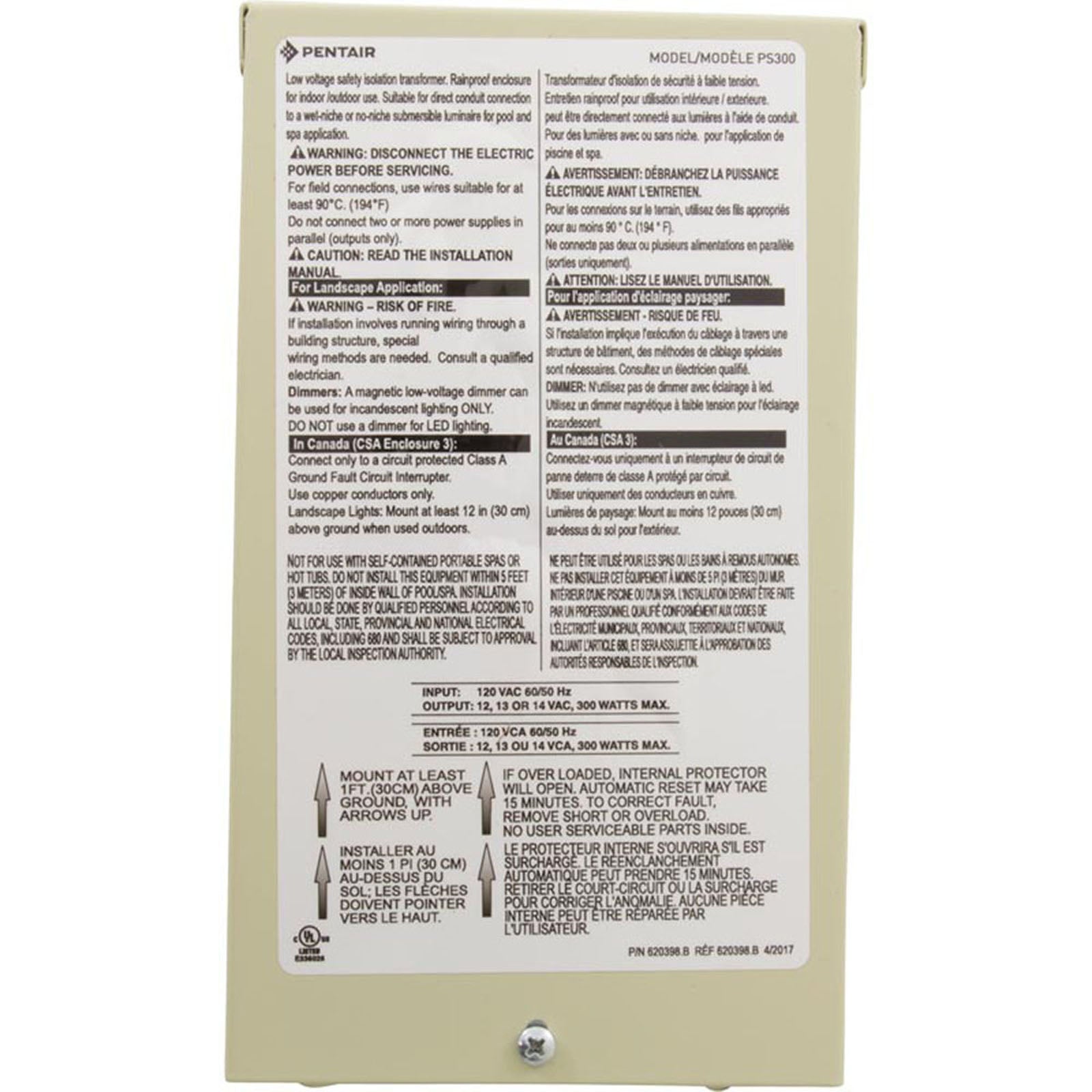 This is a Pentair 619963 transformer, stepping down voltage from 12V to 14V with a 300W capacity. Ideal for powering various pool and spa lighting and equipment.